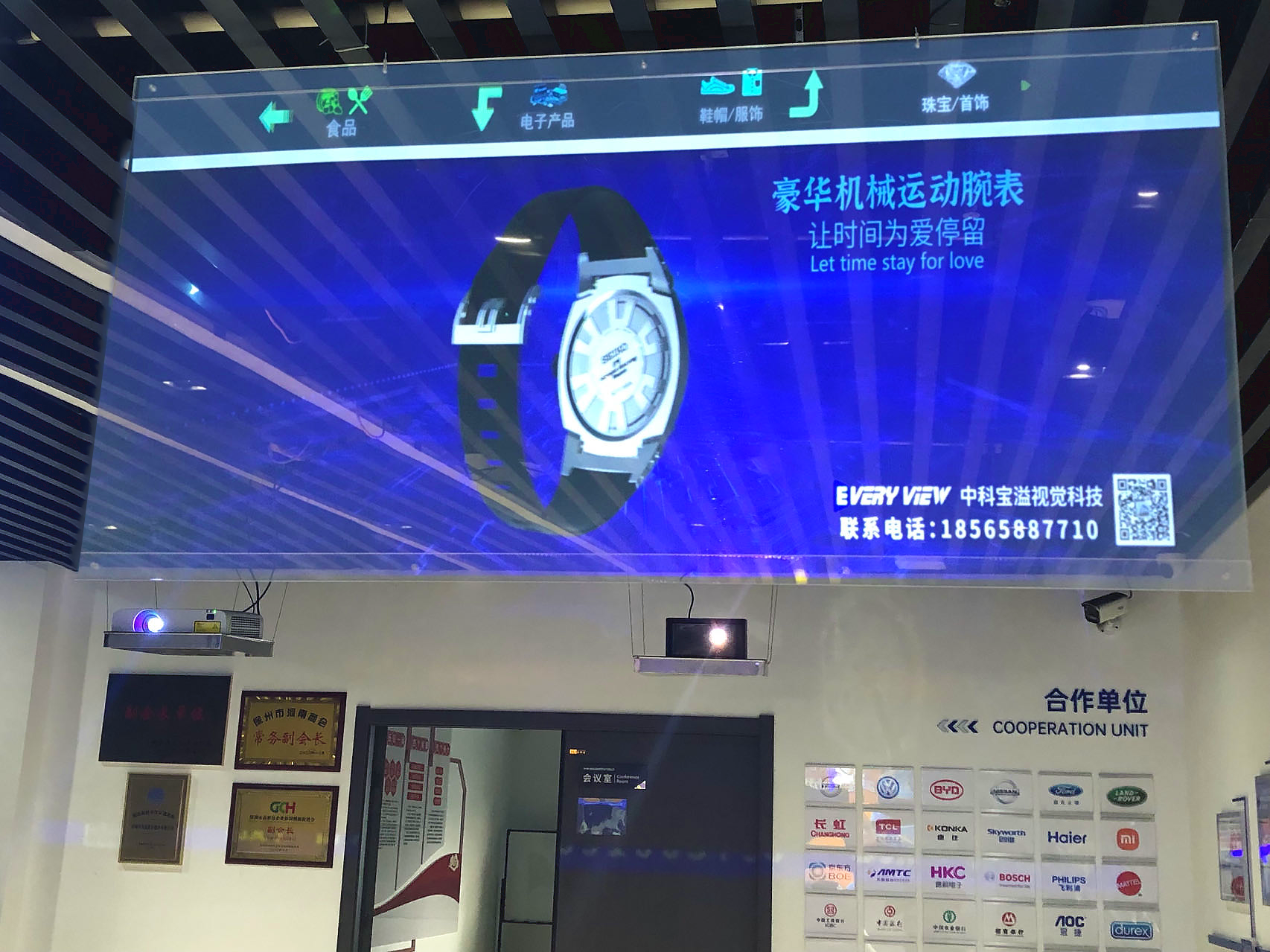 The double-sided rear projection video wall operates on the same rear projection principle, where projectors emit light from behind the screen to produce clear images on both sides. The modular multi-screen configuration allows for expanded display areas and enhanced presentation of advertising content.